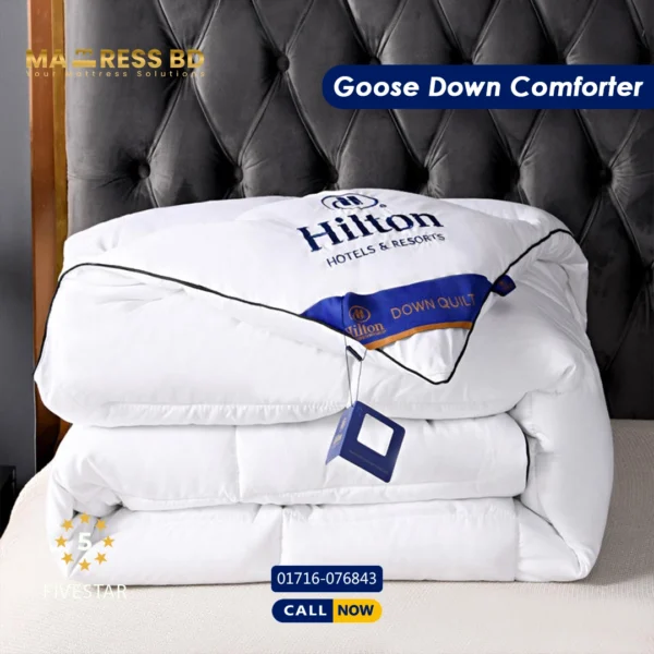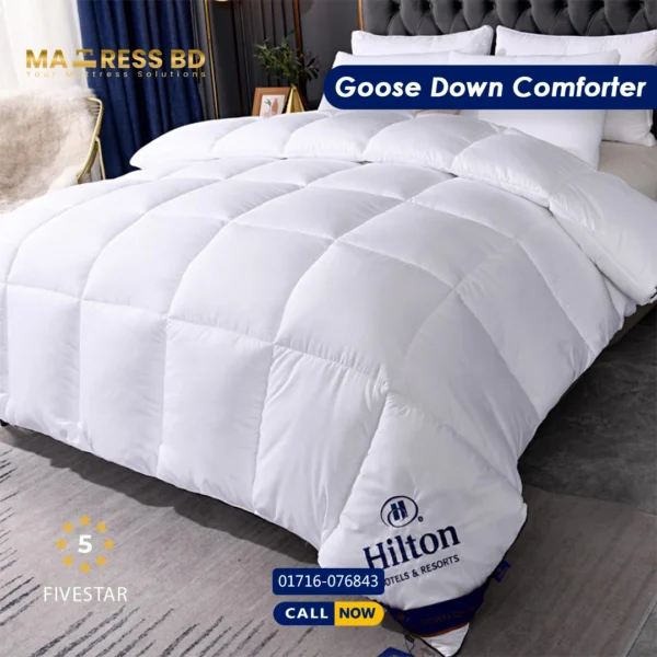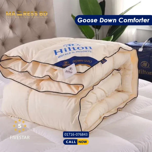 • Down-Proof Organic Cotton Shell: To complement the premium filling, the outer shell is crafted from high-thread-count cotton. This fabric is specially woven to be “down-proof,” ensuring that the soft clusters stay inside the comforter where they belong, while offering a crisp, smooth feel against your skin.